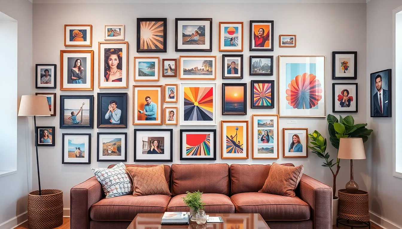 In living rooms, a gallery wall serves as a focal point that captivates guests. Consider incorporating a mix of artwork, family photos, and travel mementos. Use large statement pieces alongside smaller items for visual contrast. Select a color palette that complements existing decor to enhance the overall aesthetic. Individuals can arrange pieces in a grid pattern for a streamlined look or opt for an eclectic layout for a dynamic appearance. Placement above a sofa creates an inviting atmosphere, while pieces should be hung at eye level for optimal viewing.